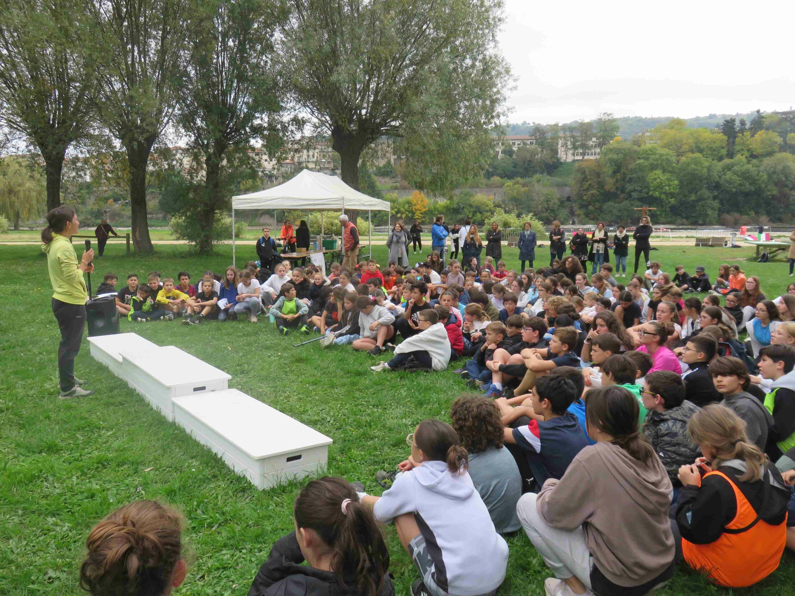 Une boucle d’un kilomètre était proposée et les élèves ont couru en relais par équipe représentant chacune un pays différent. Tous les niveaux étaient mélangés au sein d’une même équipe afin de créer de la cohésion et de la solidarité entre des élèves. Les plus grands avaient donc un rôle de « coach » et accompagnaient les plus jeunes dans leurs efforts.